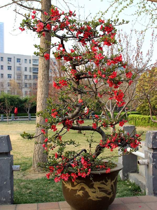 貼梗海棠它又叫作皺皮木瓜,而且還有許多的叫法,是落葉灌木的一種,它在園林綠化上屬于觀花、觀果的優良品種;特別是在花期的時候,滿樹花朵非常的艷麗,顏色多樣;貼梗海棠不但在園林效應上有它的風采,而且它的果實還可以吃,果實營養豐富含維生素多,在醫學上也有它的獨特功效;貼梗海棠在綠化上可以栽種在景區、道路兩邊、庭院等地方;還可以在一些綠化樹中栽種一兩棵貼梗海棠,可以起到點綴的效果,成片的栽種也有不一樣的觀賞效果;它不僅可以地栽也可以制作為盆景,造型多種,常被放置在客廳、花臺、陽臺、門庭邊都可以,下面我們就來欣賞一下它的各種造型盆景吧: